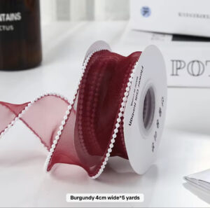 Elegant maroon organza ribbon with pearl-edged borders, perfect for gift wrapping, bouquets, and decorative crafts.